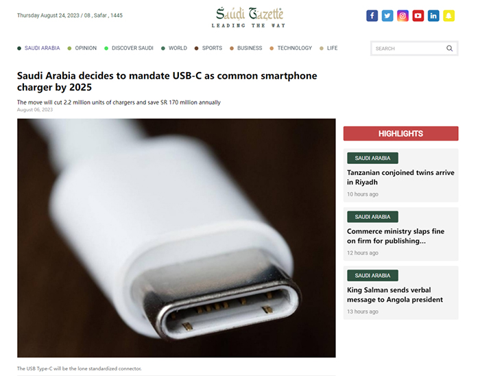 发布时间:2023-08-25 2023年8月4日,沙特阿拉伯通过WTO对外发布TBT通报G/TBT/N/SAU/1297,沙特标准计量和质量组织 (SASO) 董事会通过了关于统一智能手机和电子设备充电器类型的决定草案。根据决定内容,自2025年1月1日起,USB Type-C将成为唯一的标准化连接器。